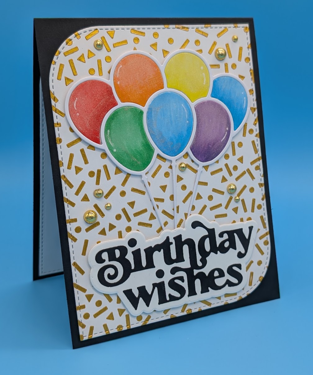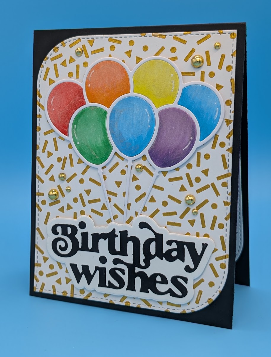 On a white card stencil the Party Time pattern with the Lunar Paste. Let dry completely and then die cut with the largest rectangle, adhere to a black card base. Die cut the balloons and color as desired. Use the glitter pen and white gel pen to add sparkle and dimension. Adhere the balloons with foam tape. Die cut the sentiment and adhere with foam tape as shown. Adhere the pearls as desired.