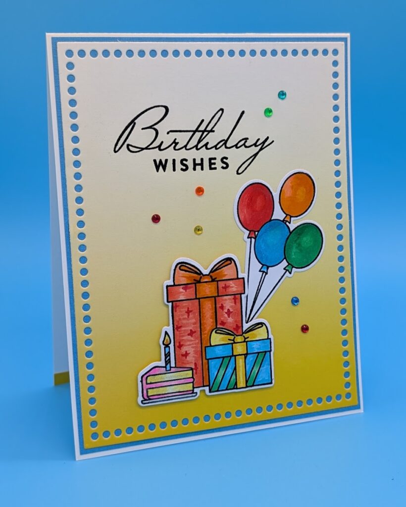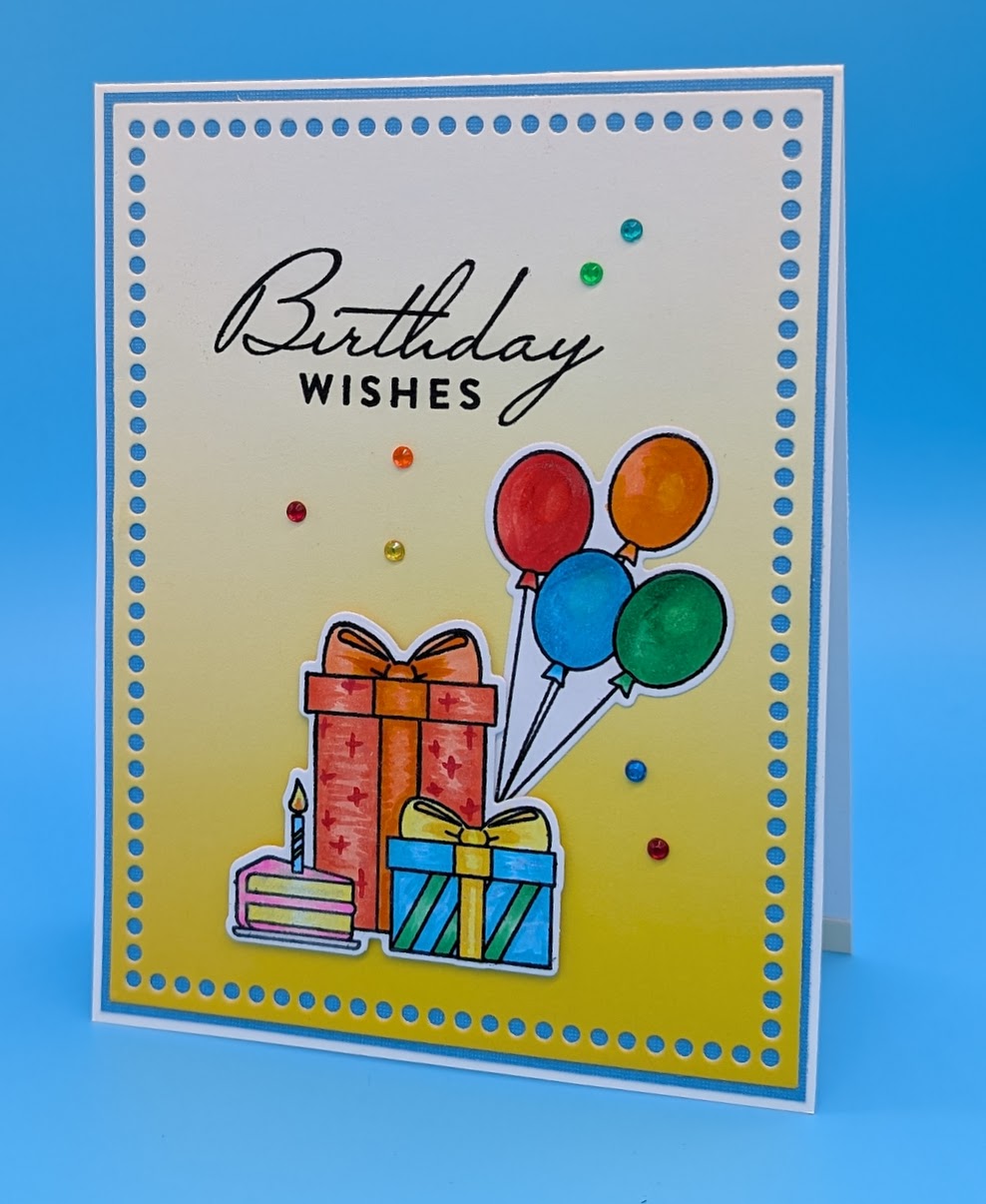 Stamp the gifts and balloons and color as desired, die cut. Use the glitter pen to add sparkle to the gifts and balloons. Choose an ombre pattern paper and die cut with the largest Marquee rectangle. Adhere to a coordinating solid card and adhere that to the card base. Stamp the sentiment in black ink, sprinkle with clear embossing powder and heat. Adhere the gifts with foam tape and the balloons with adhesive. Adhere the gems as desired.