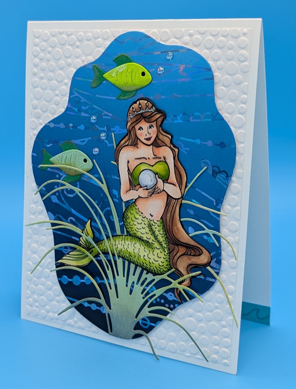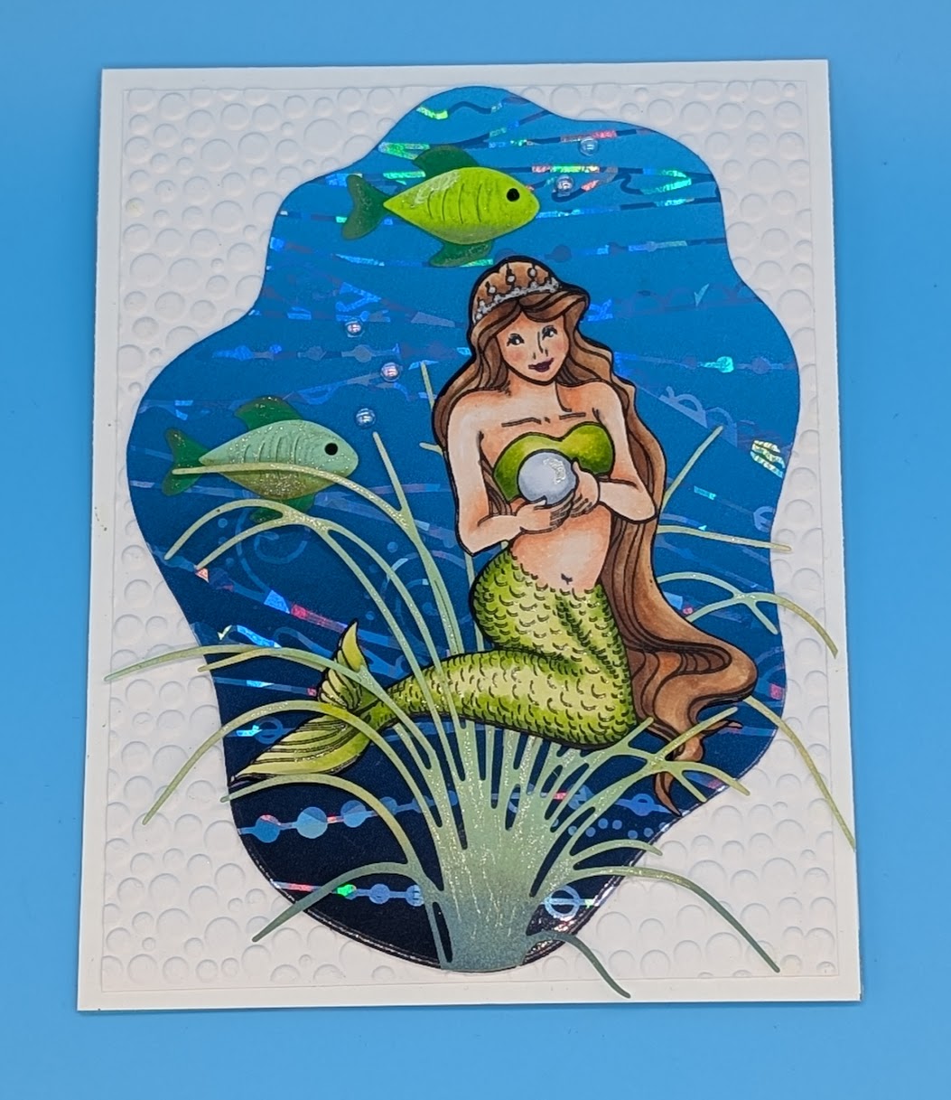 Emboss a 4″ x 5 1/4″ white card with Bubbles, adhere to card front. Foil solid toner sheet with the Shattered Blue CheerFoil, die cut with the large Wavy die. Adhere to card front with foam tape. Stamp mermaid and color as desired and die cut. Die cut grass and fish, ink blend and adhere to card. Nestle mermaid into grass and adhere with foam tape. Add clear gems in front of fish. Add glitter pen to grass, mermaid and fish.