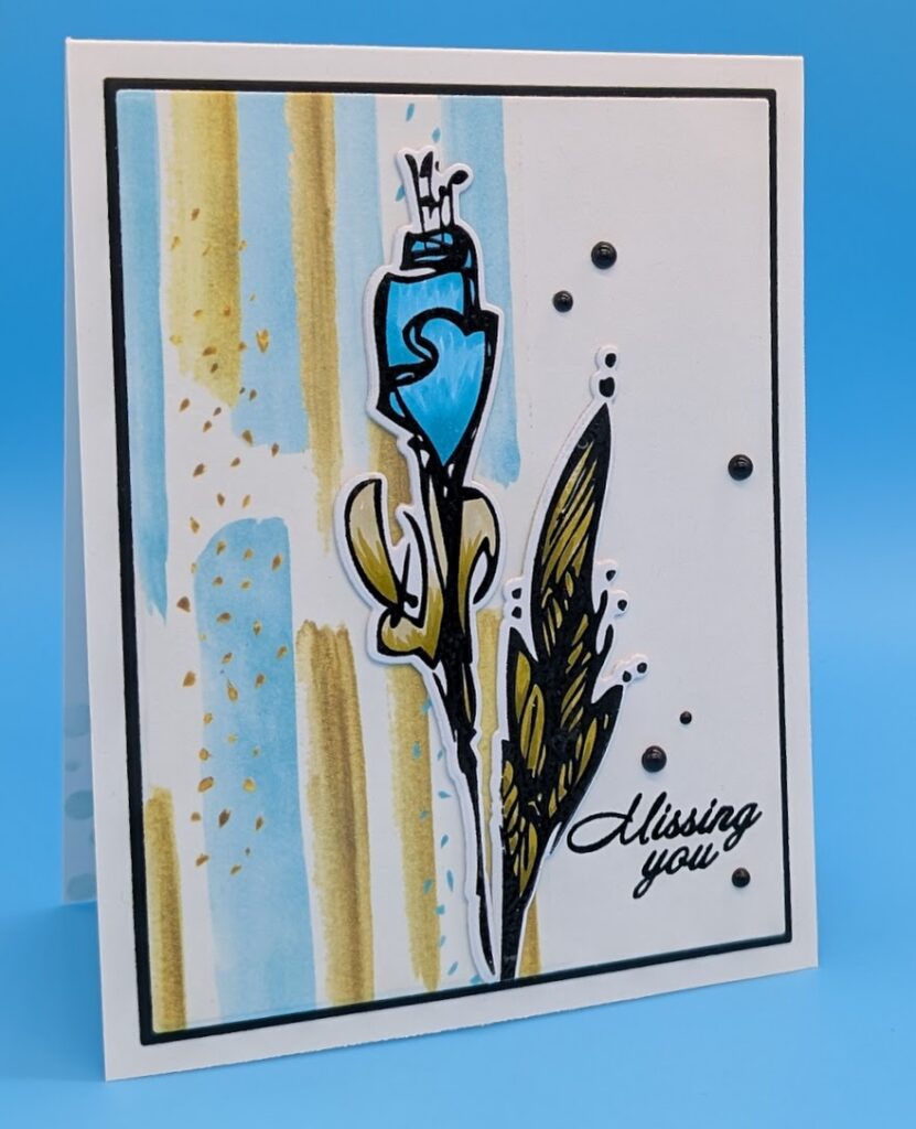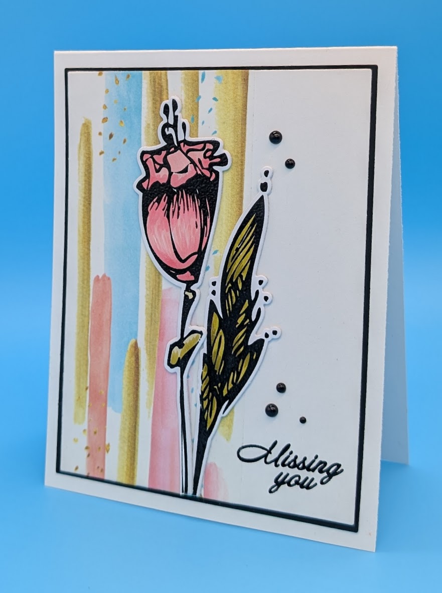Die cut the layers with Master Layouts 1. On the white card spread the Washi Tape on the left side. Stamp the flowers on white card, sprinkle with clear embossing powder and heat. Die cut the flowers and color as desired. Adhere to card with foam tape. Stamp the sentiment in black ink, sprinkle with clear embossing powder and heat. Add beads as desired.