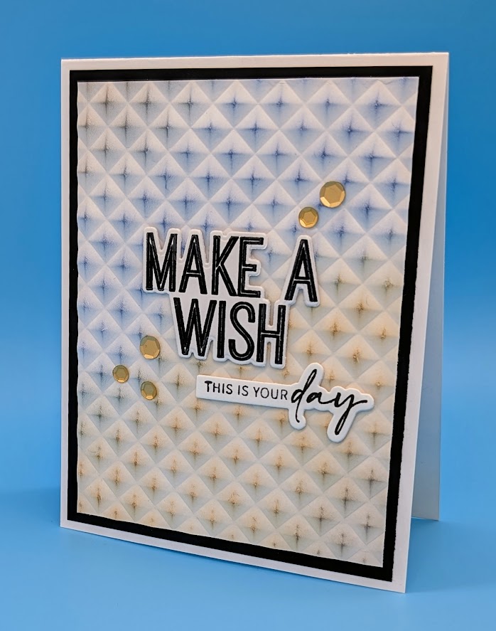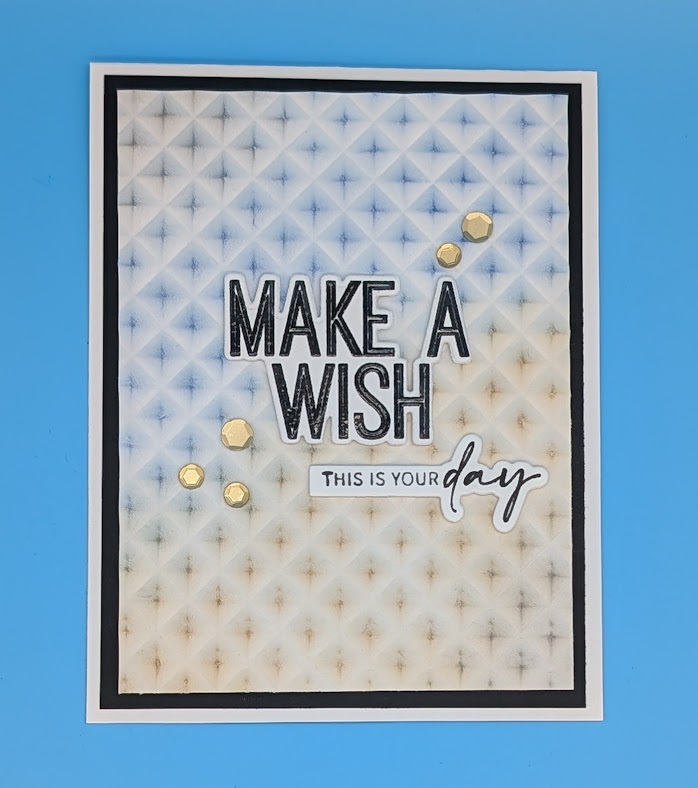 Ink blend a white panel diagonally with complimentary colors and emboss with the Lattice folder.  Trim to size and layer a larger black card behind it.  Adhere to card base.  Stamp sentiment, sprinkle with clear embossing powder and heat.  Die cut sentiment and adhere to card base.  Stamp and add secondary sentiment as shown.  Adhere sequins as desired.