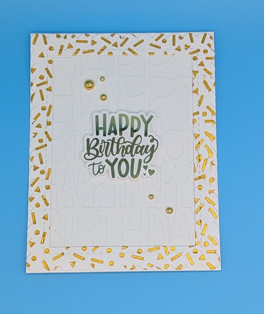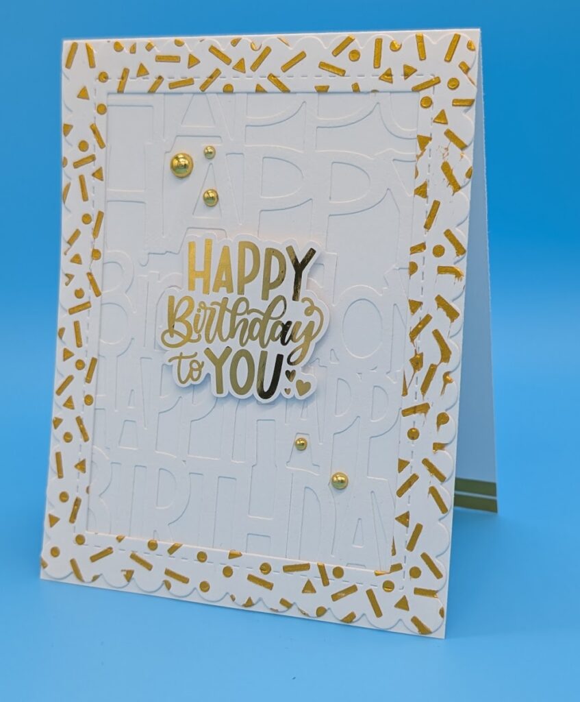 Foil Sentiment. Die cut the background out of white card and adhere it to the card base. Stencil the Party Time pattern with Lunar Paste on a white card, let dry completely; die cut with the largest Scalloped Frame die. Adhere the frame over the background die. Adhere the sentiment with foam tape and adhere the pearls as desired.