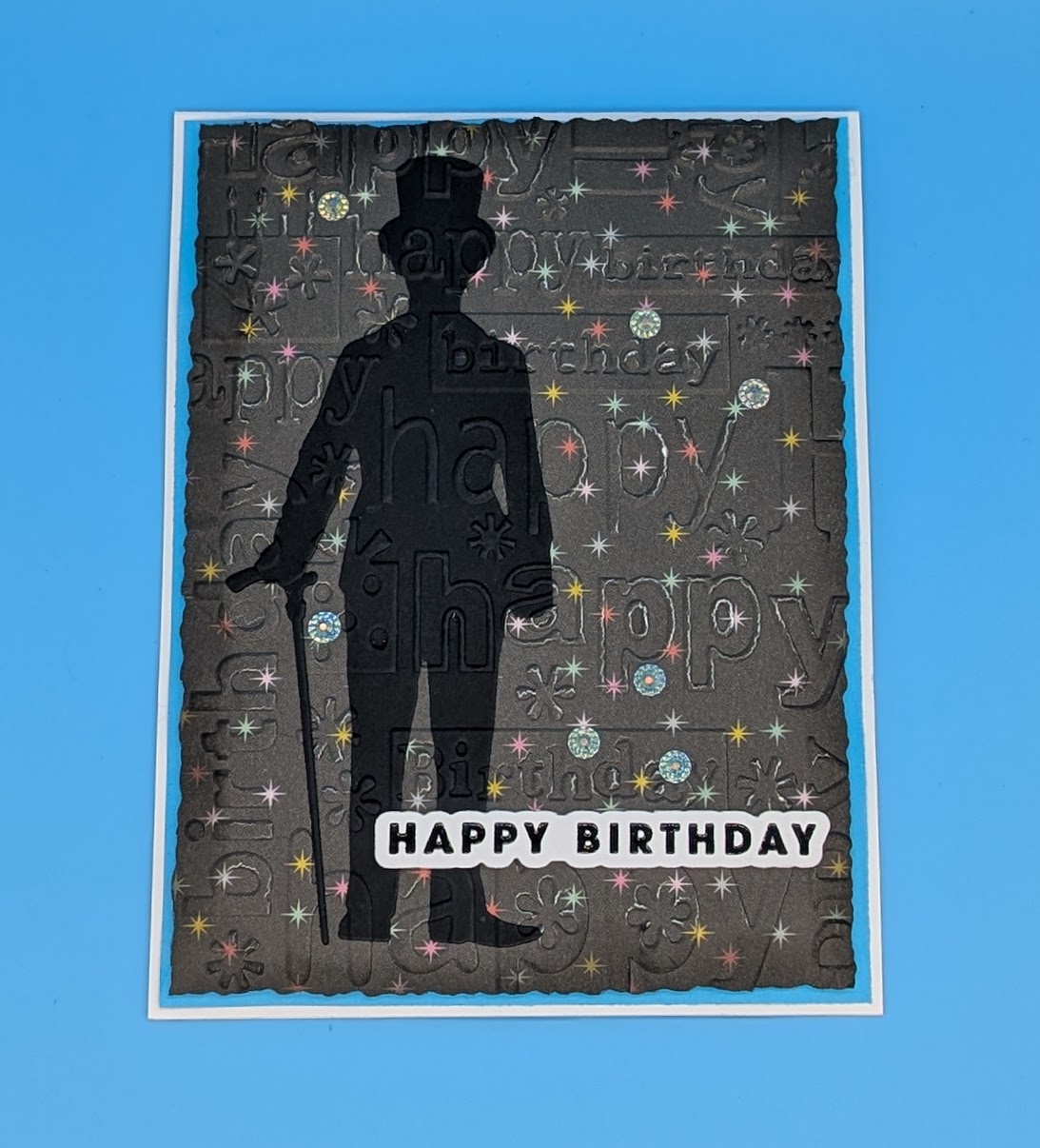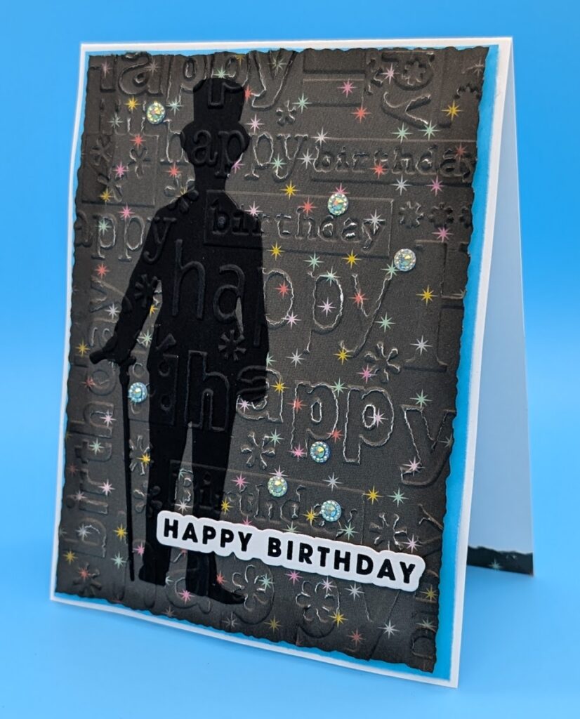 Die cut a Gentleman out of black card and adhere him to pattern paper. Dry emboss the pattern paper with the Happy Birthday folder and trim with the Deckle Edge Trimmer. Ink blend the edges. Adhere the embossed card with foam tape to a color card and adhere to the card base. Adhere sentiment with foam tape and add gems as desired.