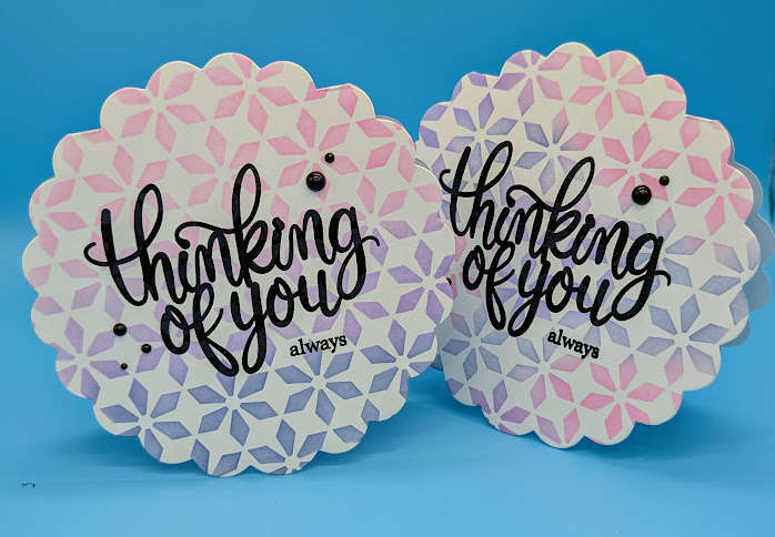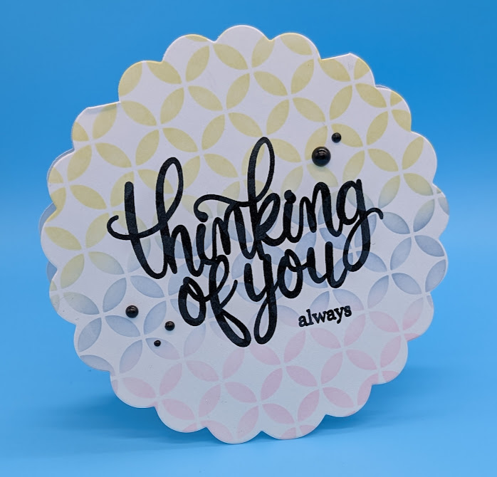 Purchase or create your own shaped card. These scallop cards were in my stash for years. I decided to use them up. Choose your preferred stencil and colors and blend directly onto the card base. Stamp the sentiment and sub sentiment in black ink and sprinkle with clear embossing powder and heat. Add beads as desired. This is a quick card easily batched.