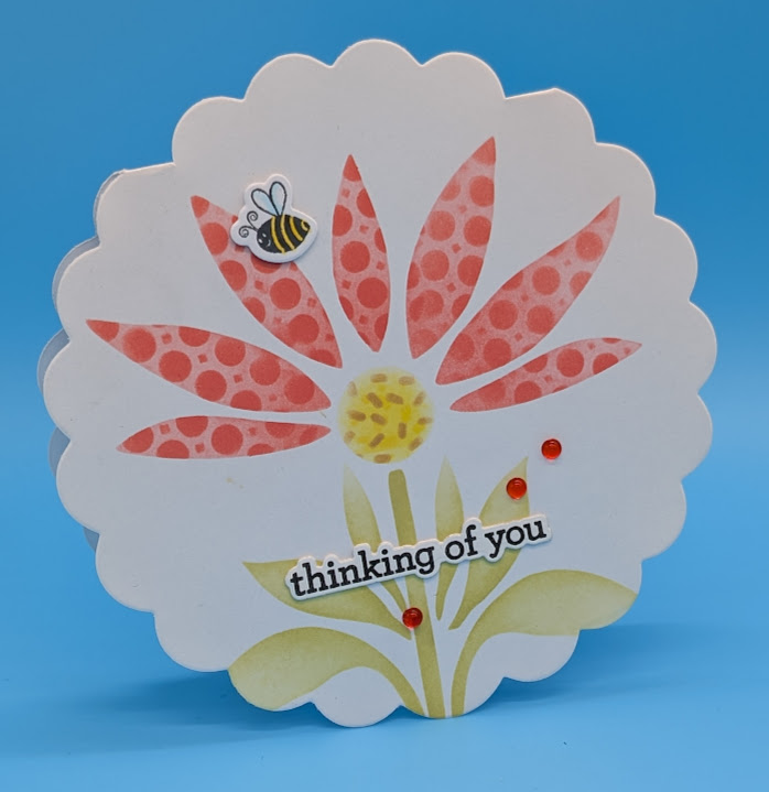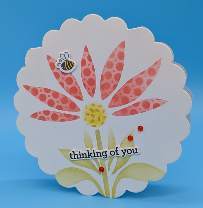 Purchase or create a shaped card. This scallop card has been in my stash for years. Stencil the flower directly onto the card base. Adhere sentiment and bee to card with foam tape. Add droplets as desired. This card is quick and easily batched.