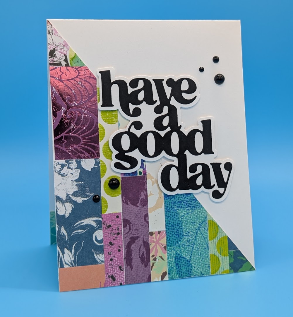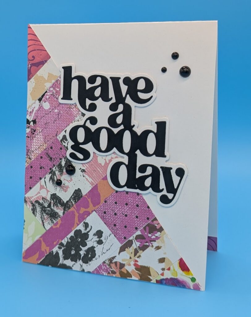Cover an A2 size white card with strips of leftover patterned paper. This can be done on a diagonal as shown or horizontally or vertically. Strips can be any thickness to add more interest. Cut the finished card on a diagonal (corner to opposite corner) and adhere one diagonal to a white card. Add a large sentiment and beads as shown.