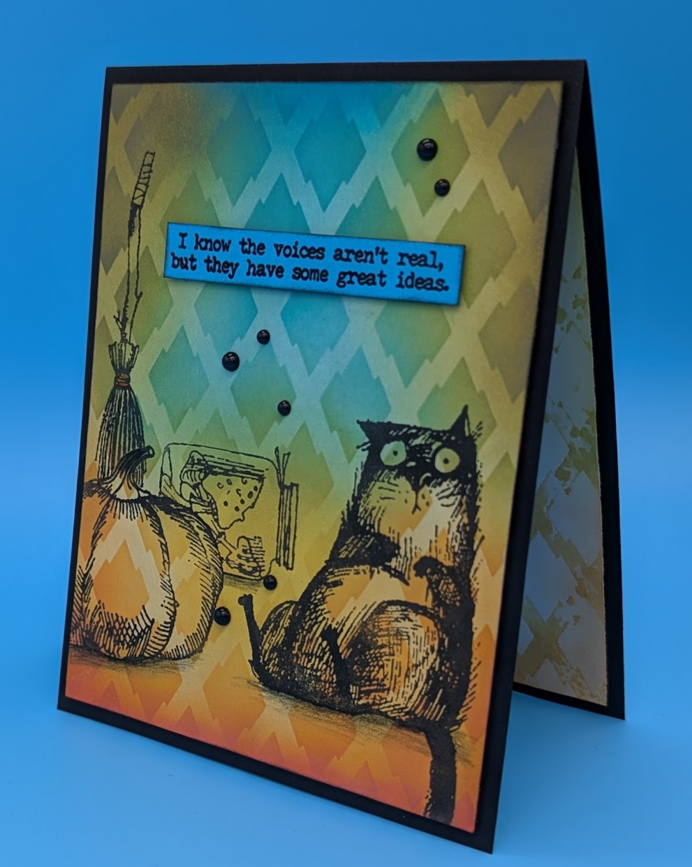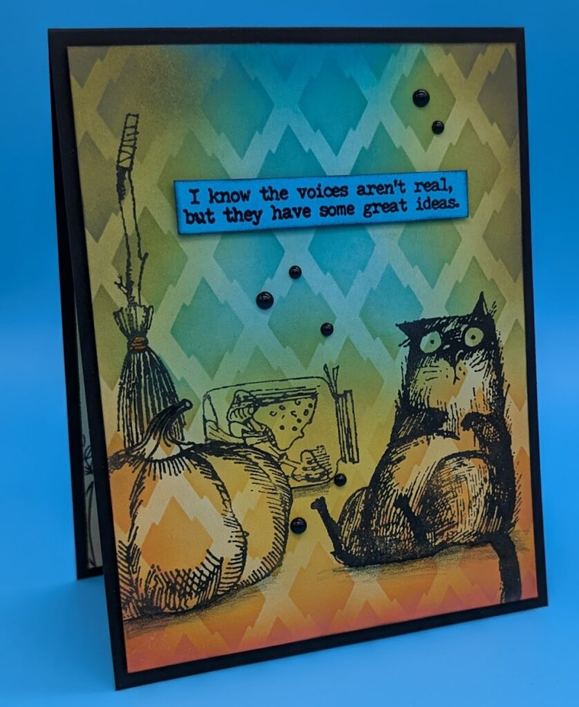 Ink blend over a stencil on a 4″ x 5 1/4″ white card. Lightly blend over the white spaces with the same color of ink. Let completely dry. Stamp images in black ink. Stamp sentiment on blue card, sprinkle with clear embossing powder and heat. Trim to size and adhere to card front with foam tape. Add shadow under cat and pumpkin with grey colored pencil. Add beads as desired. Adhere panel to card base with foam tape.