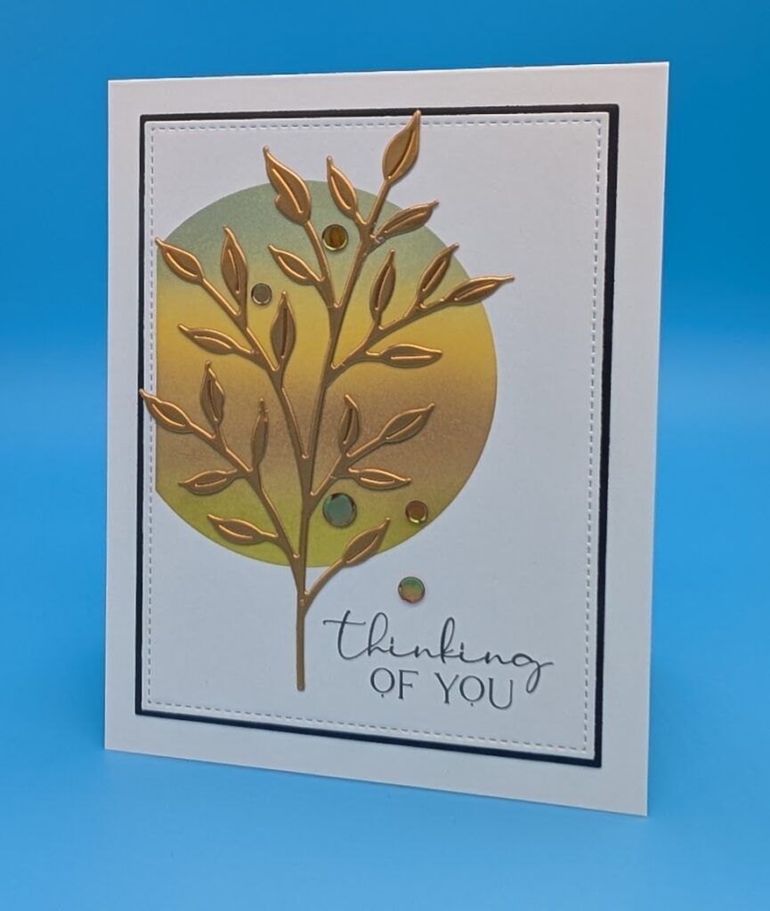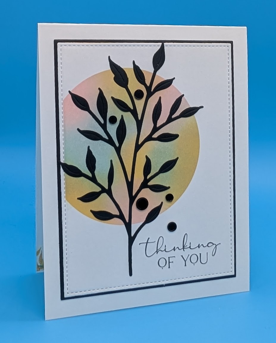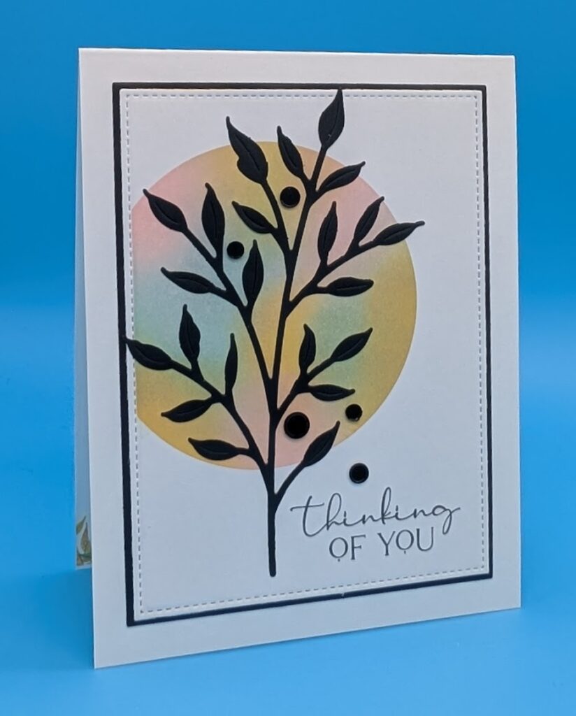 Another way to create a silhouette on your card is by adding a solid color die cut on top instead of stamping a solid image. Add a sentiment and card bling. Easily batch this design.