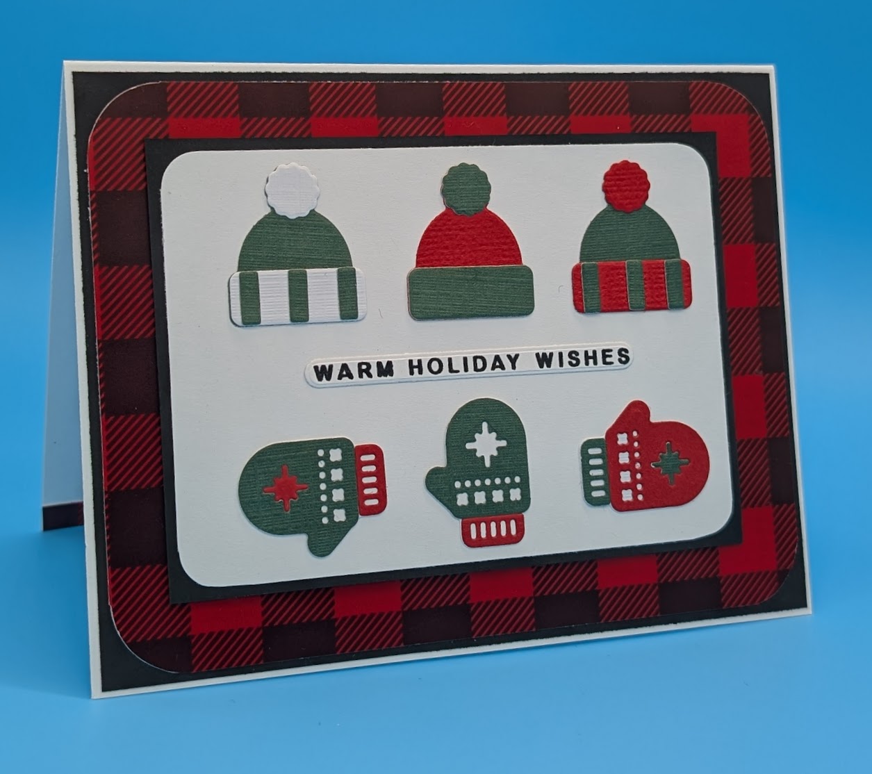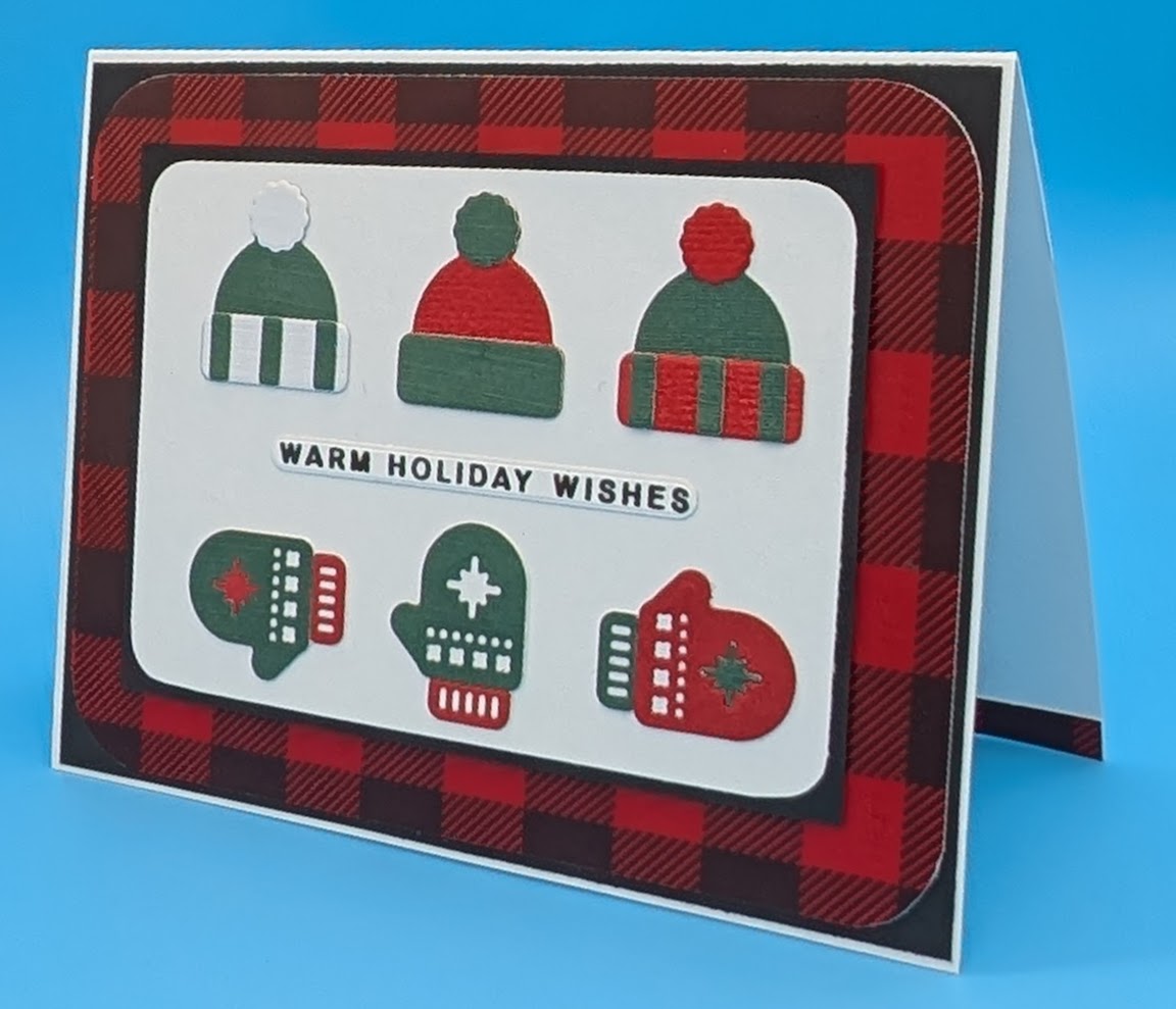 Layer corner rounded plaid card on top of black card and adhere to card base. Cut a black rectangle and a smaller white rectangle. Corner round the white card and adhere to the black card. Adhere to the card base with foam tape. Assemble the hats and mittens as desired and adhere to the center of the card as shown. Stamp sentiment in black ink, sprinkle with clear embossing powder and heat. Die cut the sentiment and adhere to the center of the card as shown.