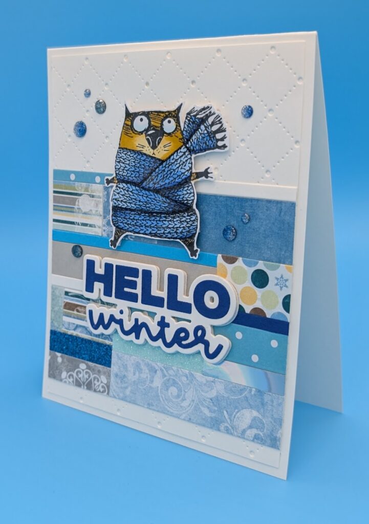 Using scrap patterned paper to make a background is any easy way to use up the scraps.  To complete the card, just add a focal image and a sentiment.  Here I added a pierced background behind the scraps to add more texture and interest.