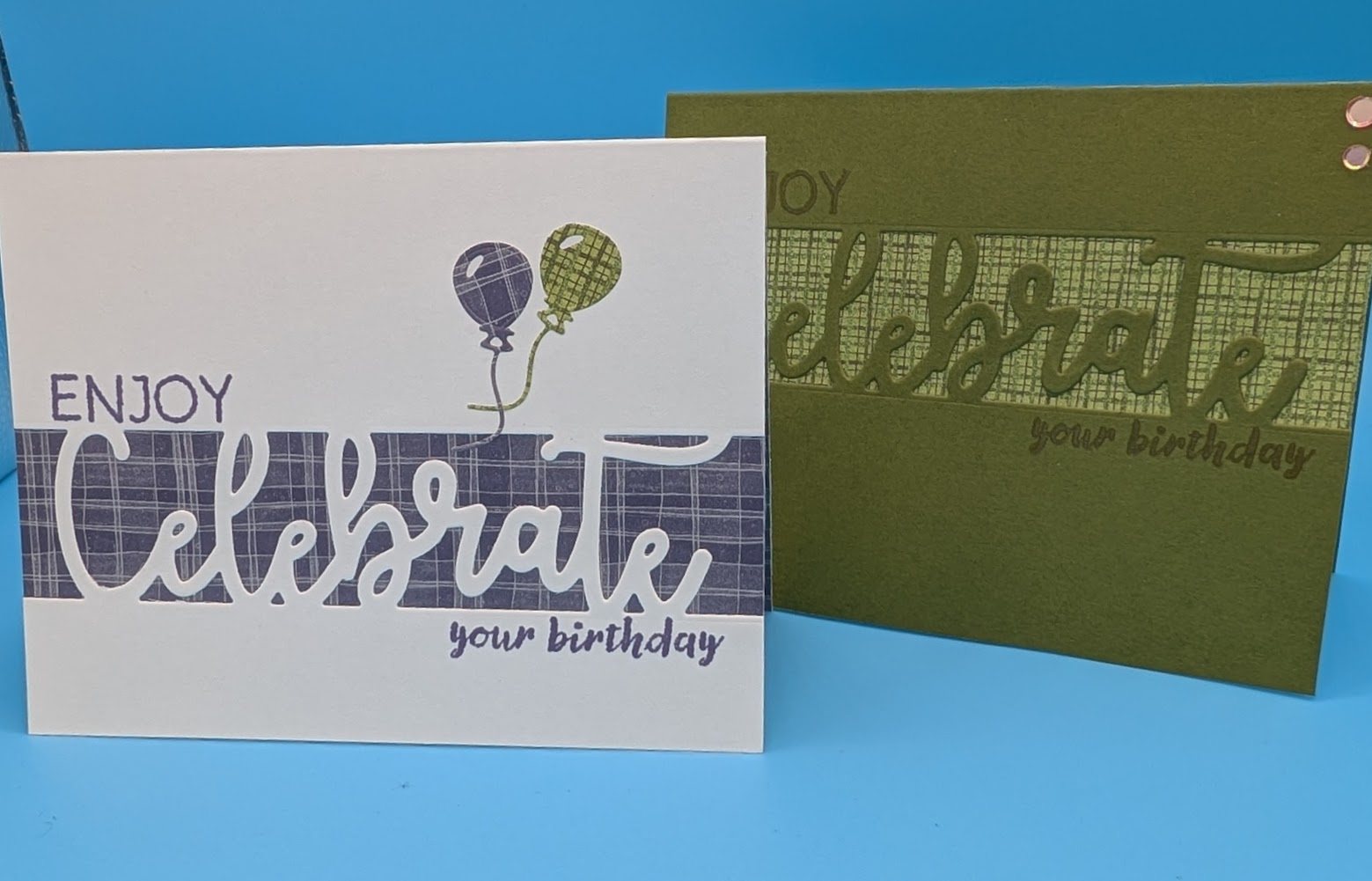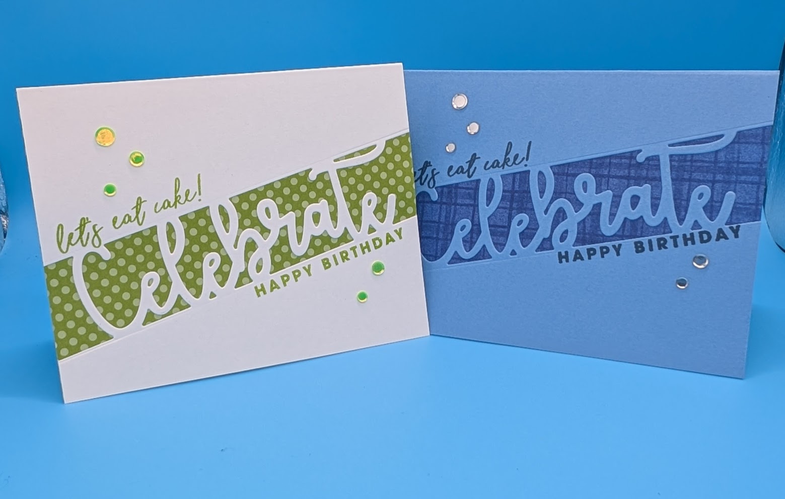 A quick way to batch cards is to use a large die such as the one that is used on these examples.  To change things up, move the die to differing heights on the card front as well as make it a diagonal cut.  Adding differing colors of card stock and pattern paper along with differing sentiments keeps things fresh.