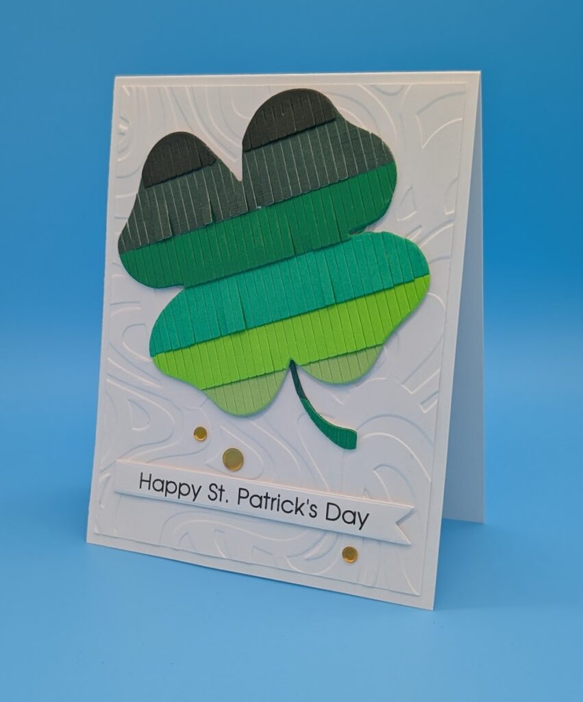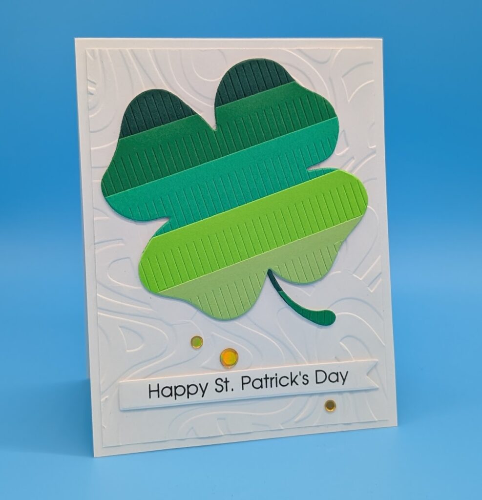 Die cut the fringe out of different colors of green card and adhere to a scrap of white card, die cut the clover out of the fringe. Two examples can be seen here with the fringe glued down completely on the left side and left free on the right side. Dry emboss the background and adhere to the card base. Adhere clover and sentiment with foam tape. Add sequins as desired. Easily batched.