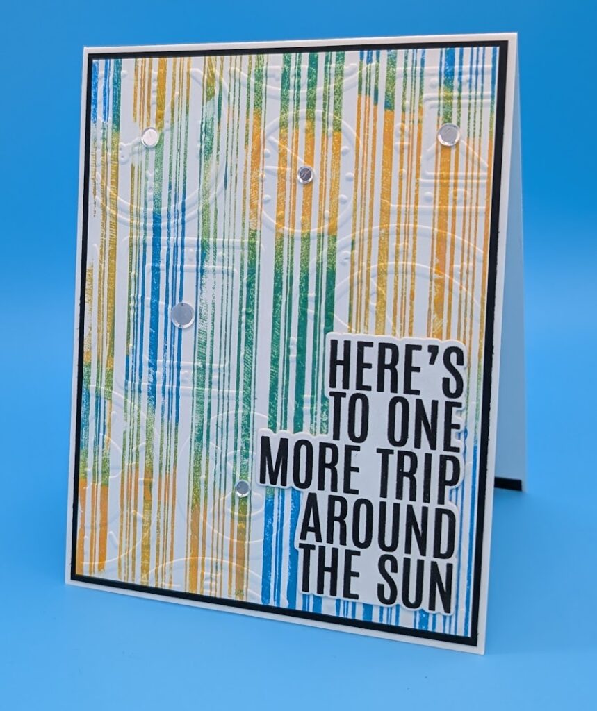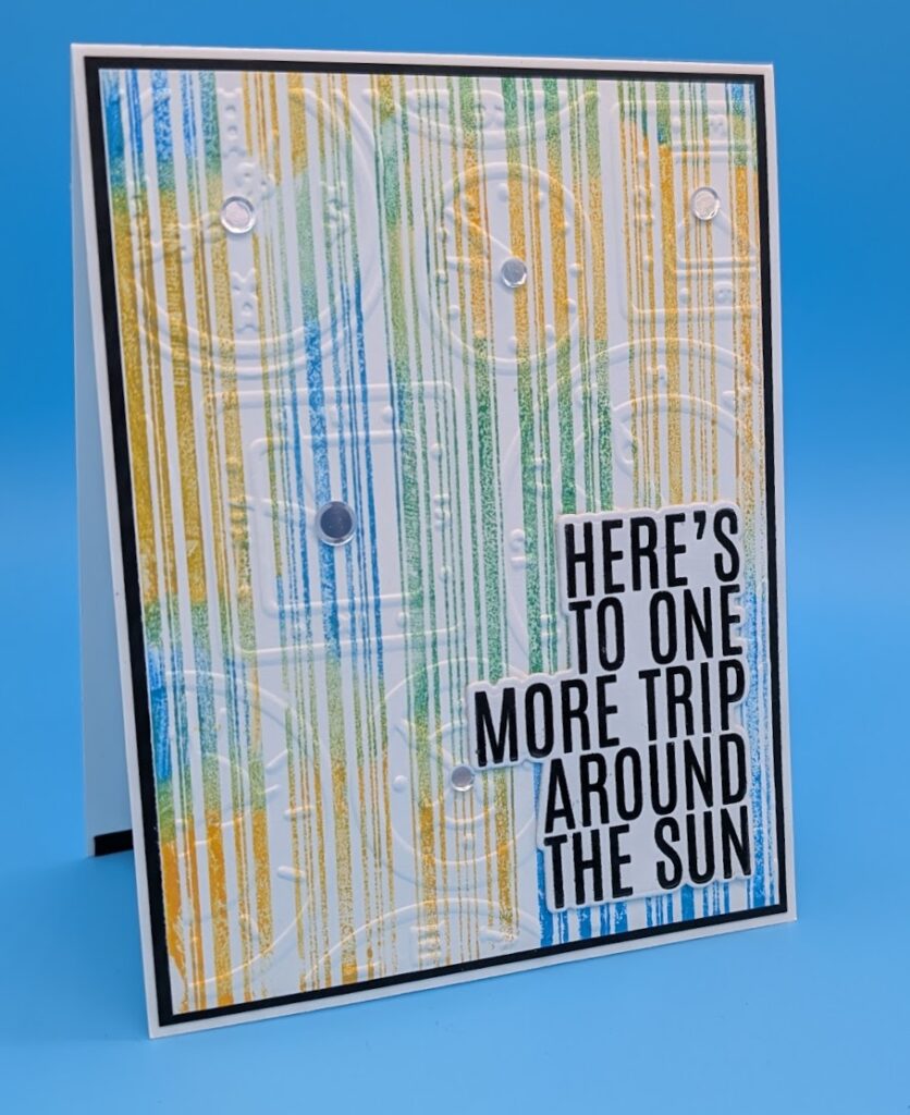 Ink Pinstripe stamp as desired and stamp onto a 4″ x 5 1/4″ white card, let dry.  Emboss the stamped panel with the Clocks embossing folder.  Layer onto a slightly larger black cardstock and adhere to card base.  Stamp and die cut sentiment and adhere to card with foam tape.  Add sequins as desired.