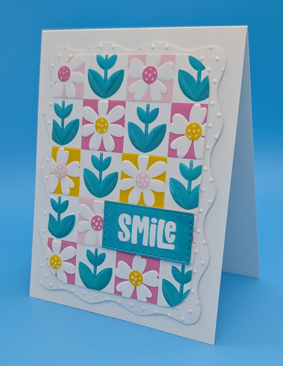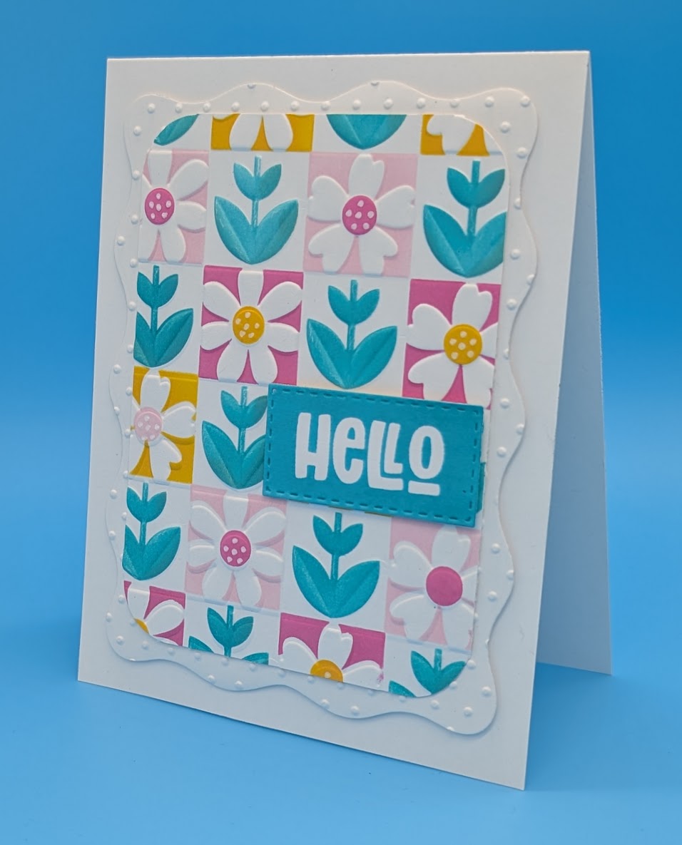 Die cut two large wavy rectangles and emboss with the Swiss Dots folder, adhere to card base. Stencil Checkered Garden pattern with desired colors and trim to slightly smaller than wavy rectangle. 3D emboss with Checkered Garden folder and round the corners, adhere to Swiss Dots panel. Use white gel pen to add dots to centers of flowers. Stamp sentiment onto white card and die cut. Adhere to card with foam tape.