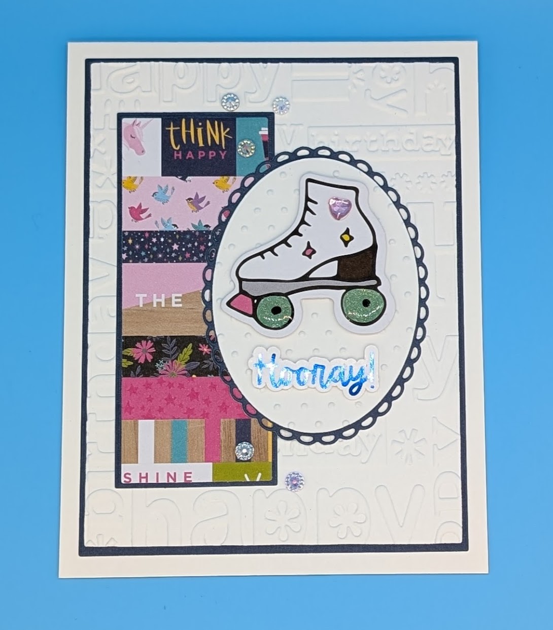 Using a layout die set combined with pattern paper, ephemera and an embossing folder can be very helpful in making a quick card or batching cards.